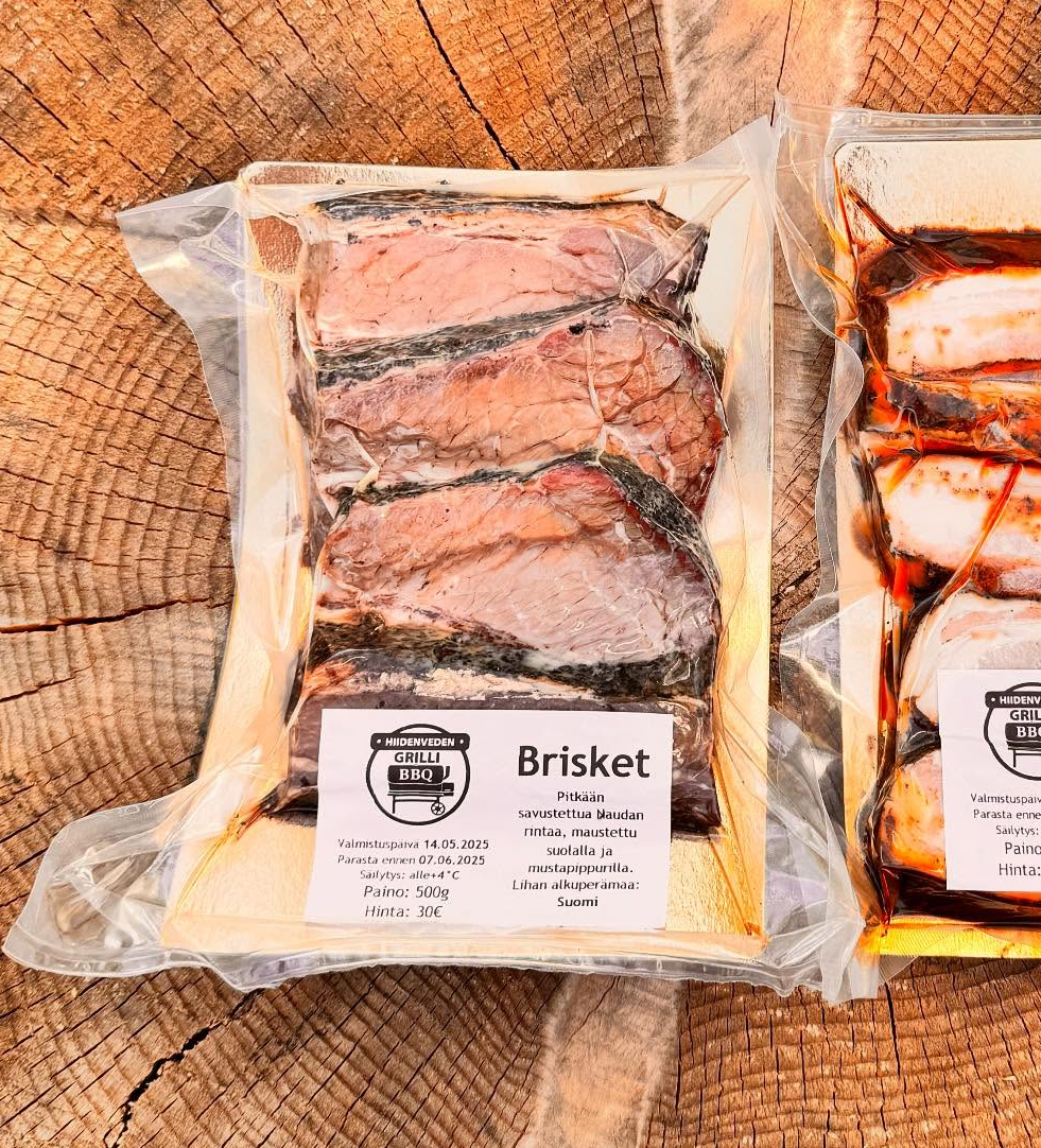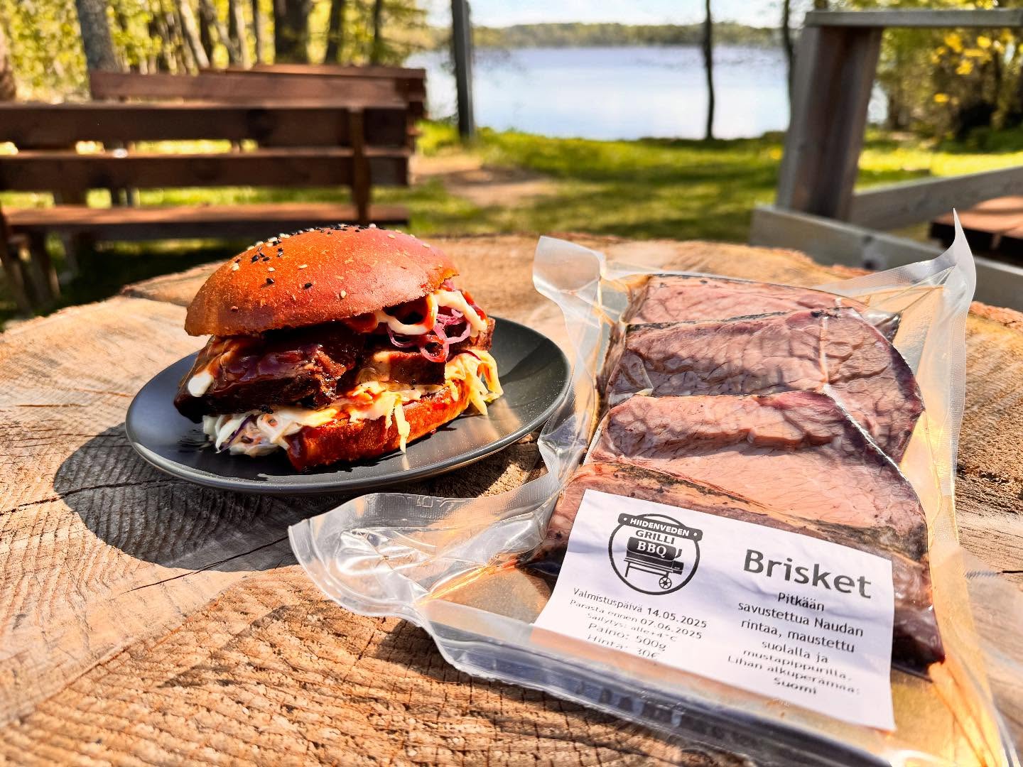 Hiidenveden grillin bravuuriliha Brisket on 14 tuntia tammisavussa kypsytettyä naudan rintaa, jossa yhdistyvät pitkä savustus ja perinteinen Texas-tyylinen valmistustapa. Liha renssataan huolellisesti ja maustetaan omalla Hiidenveden Brisket Rubilla ennen savustusta.