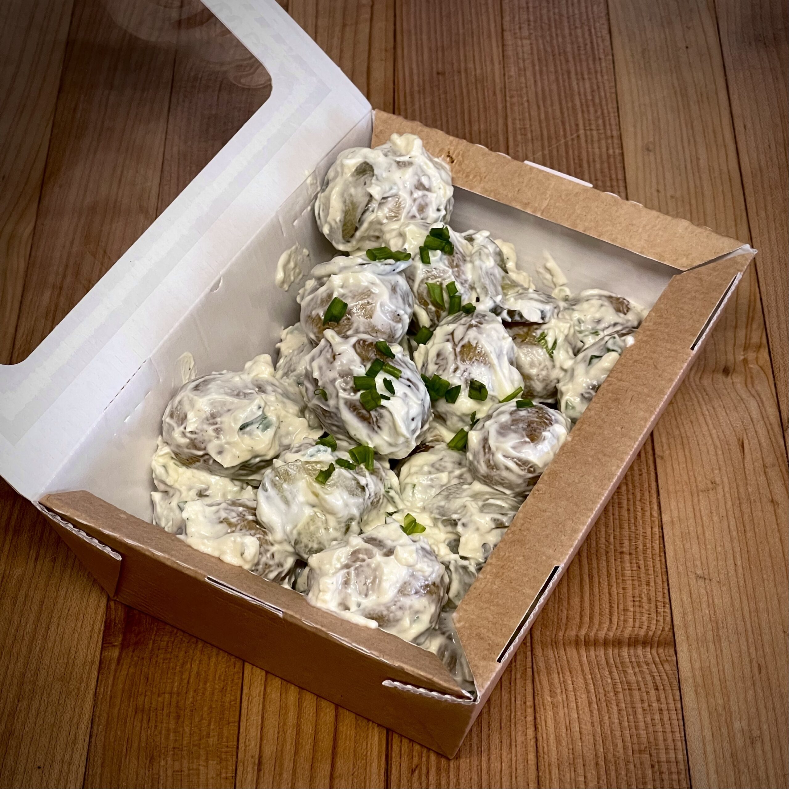 Ainesosat: Peruna, kevätsipuli, maustekurkku, kermaviili (laktoositon), Majoneesi (suola, sokeri, kananmuna, öljy, omenaviinietikka, sinappi), mustapippuri
